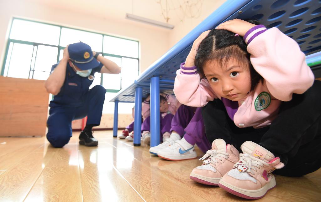 On May 11th, 2022, children of Lvyuan Sunshine Kindergarten in Nanming District of Guiyang City learned the skills of disaster prevention, mitigation and self-help under the guidance of firefighters. Xinhua News Agency (photo by Zhao Song)