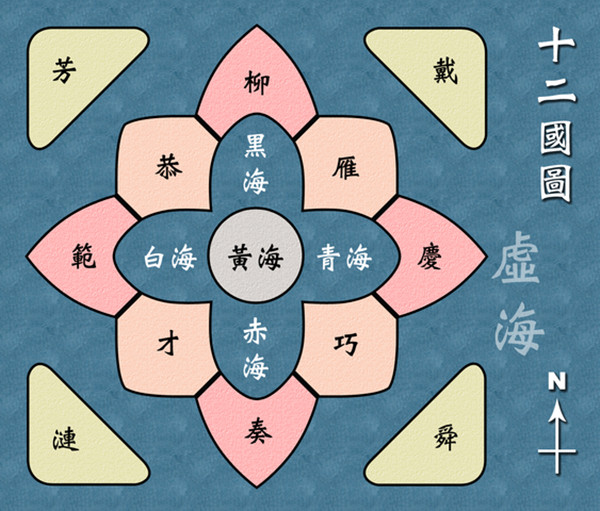 The Emperor of Heaven once destroyed the world and recreated thirteen countries. He called the middle country the Yellow Sea, with Pengshan as the center, and let the Queen Mother of the West manage it. Then he allocated kings to the other twelve countries and gave each one a branch. The snake wrapped around the branch propped up the sky. There are three fruits on the branch, one is a jade seat, the other is a country, the other is a land, and then the branch is a pen. "Land" means people, "country" means law, "pen" means history, and "jade seat" means king’s moral character. This is the creation myth of the Twelve Kingdoms.